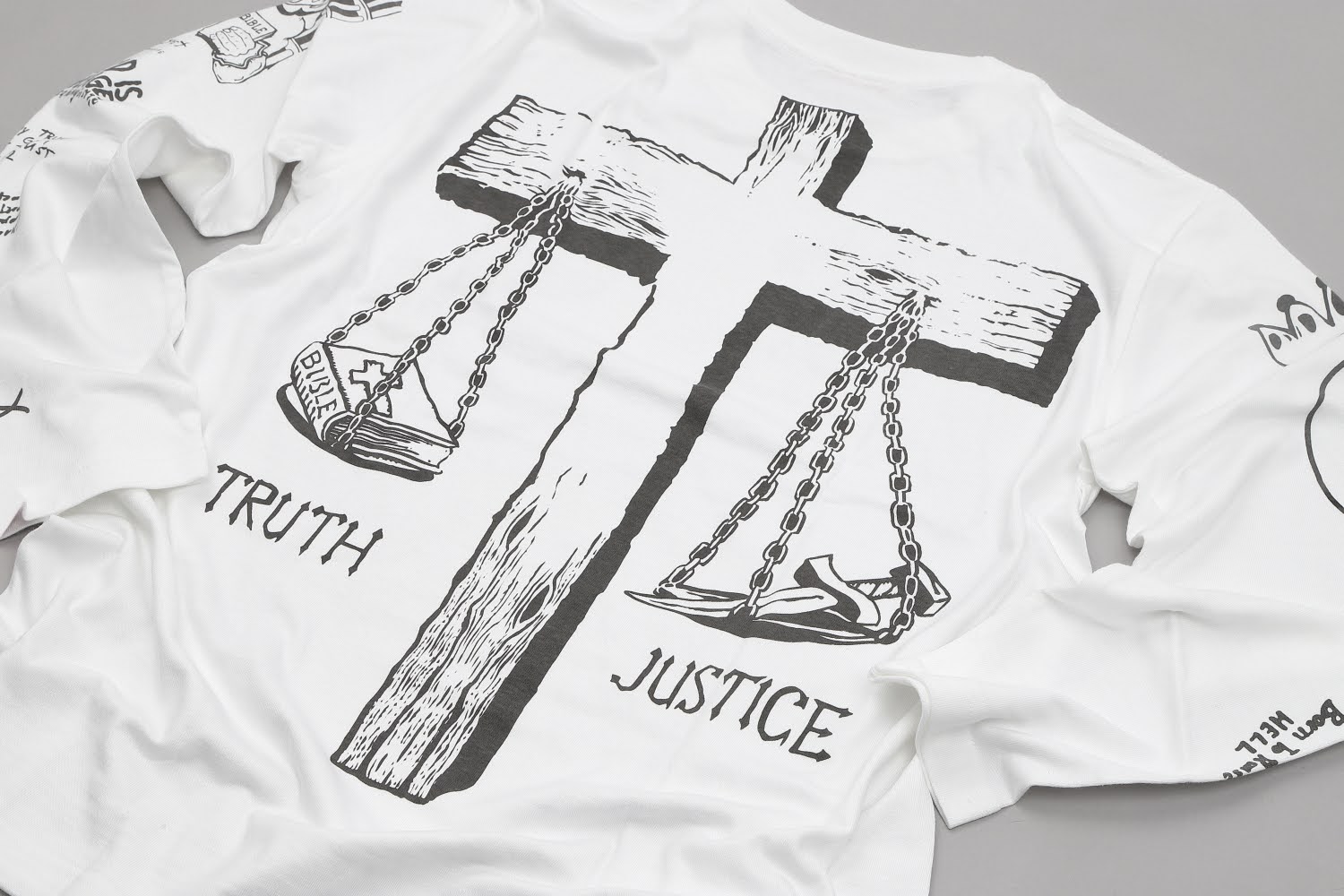 恐怖岬(ケープ・フィアー)に沈んだ復讐鬼のタトゥーを緻密に再現。胸には死神と裂けた心臓、背中には巨大な十字架が天秤となり、聖書とナイフが掛けられています。